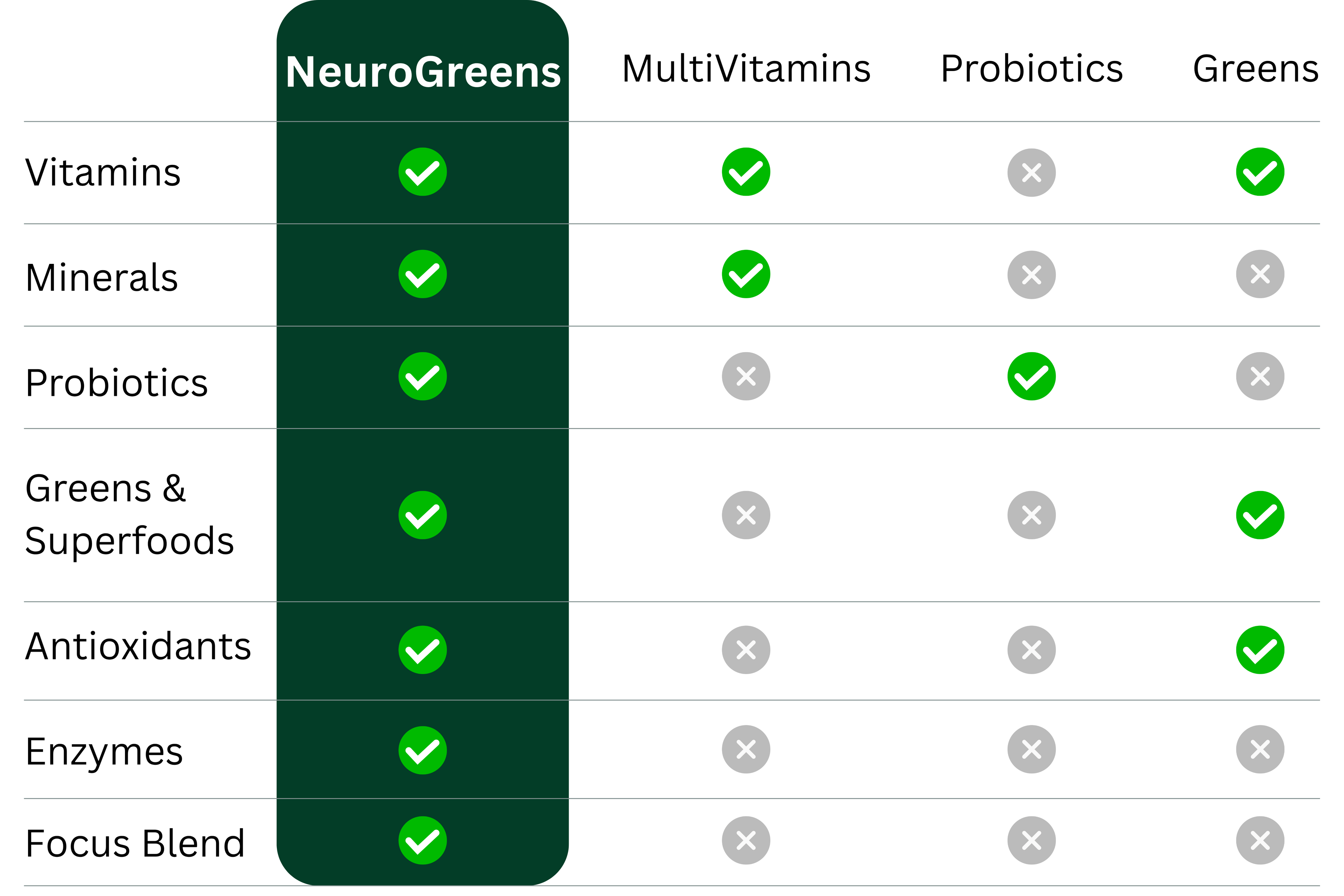 One scoop of NeuroGreens powers your day with 60+ premium ingredients, including brain-boosting nootropics, antioxidants, greens, adaptogens, and more. All in one scientifically-backed, all-in-one daily drink to support mental clarity, focus, energy, and overall wellness.*